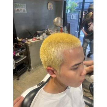フェードを入れないボウズのブリーチスタイルをご紹介! 2025/11/02 STYLE こんにちは! CHILL CHAIR 吉祥寺店 TAKAHASHIです! 本日ご紹介するヘアスタイルは全頭ブリーチのボウズスタイルです! トップは15mmのバリカンをいれて裾は10mmから繋げたボウズスタイルです! ブリ
